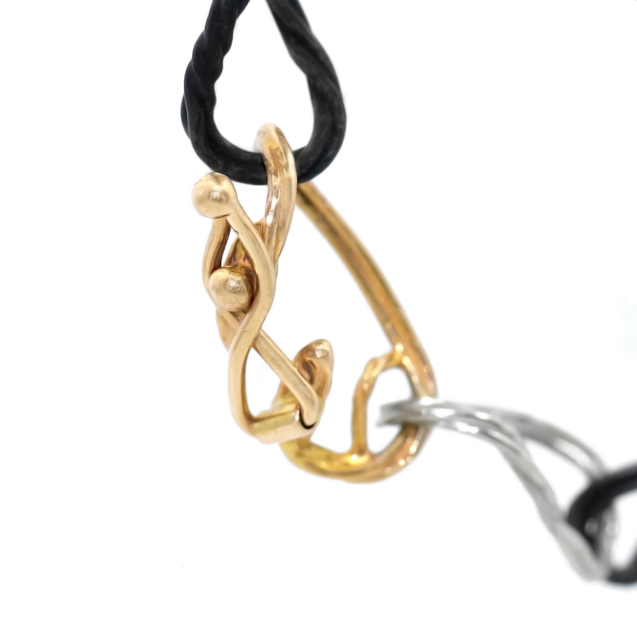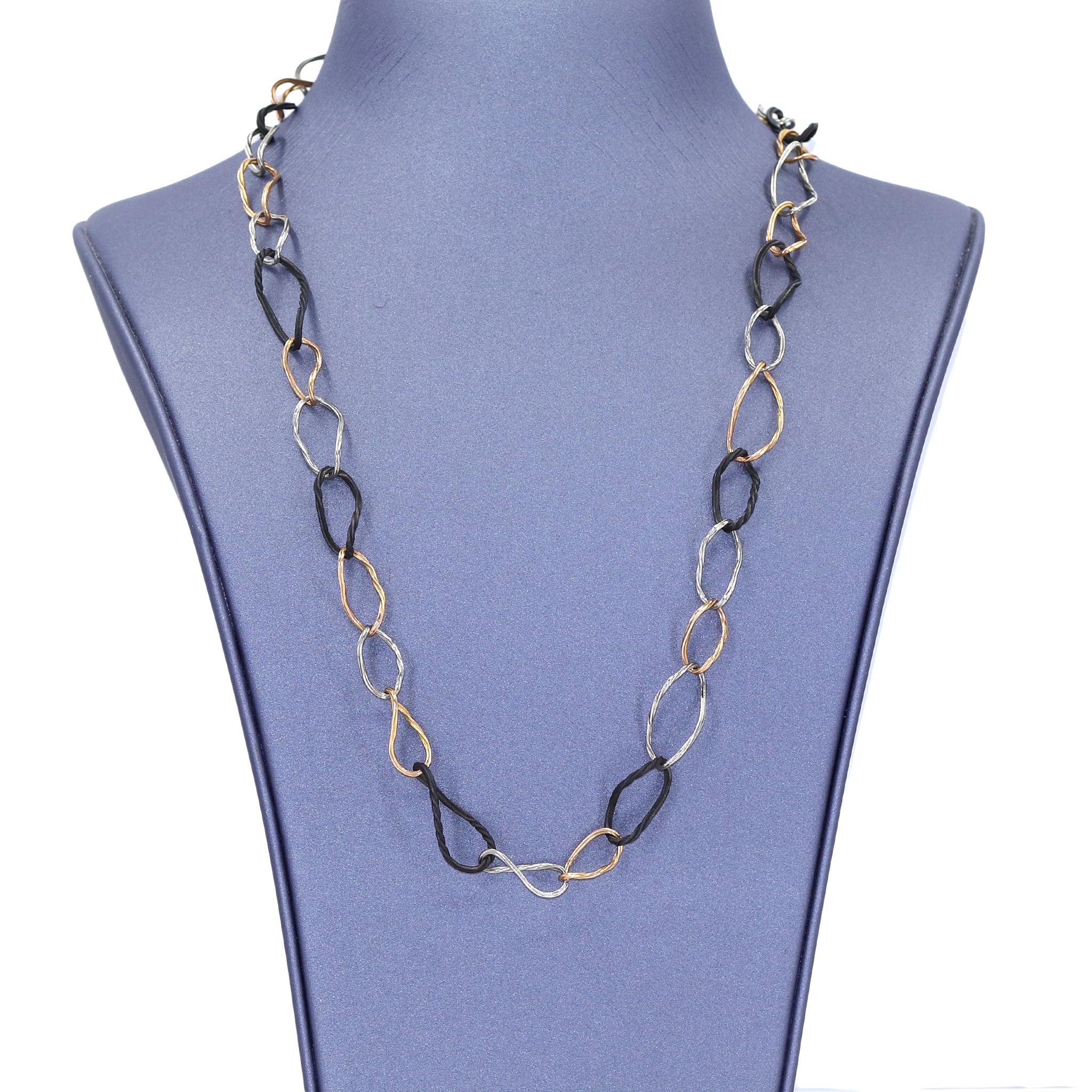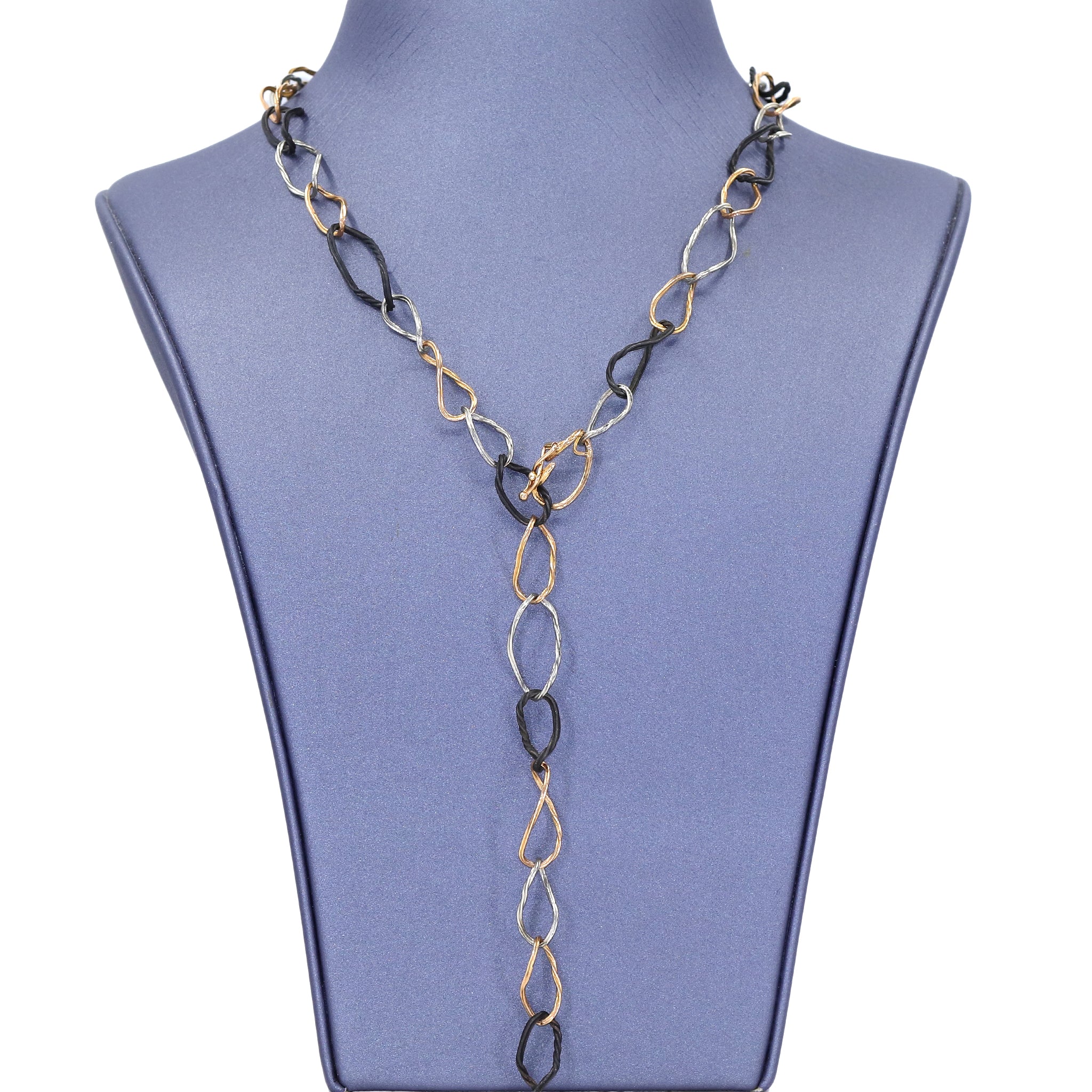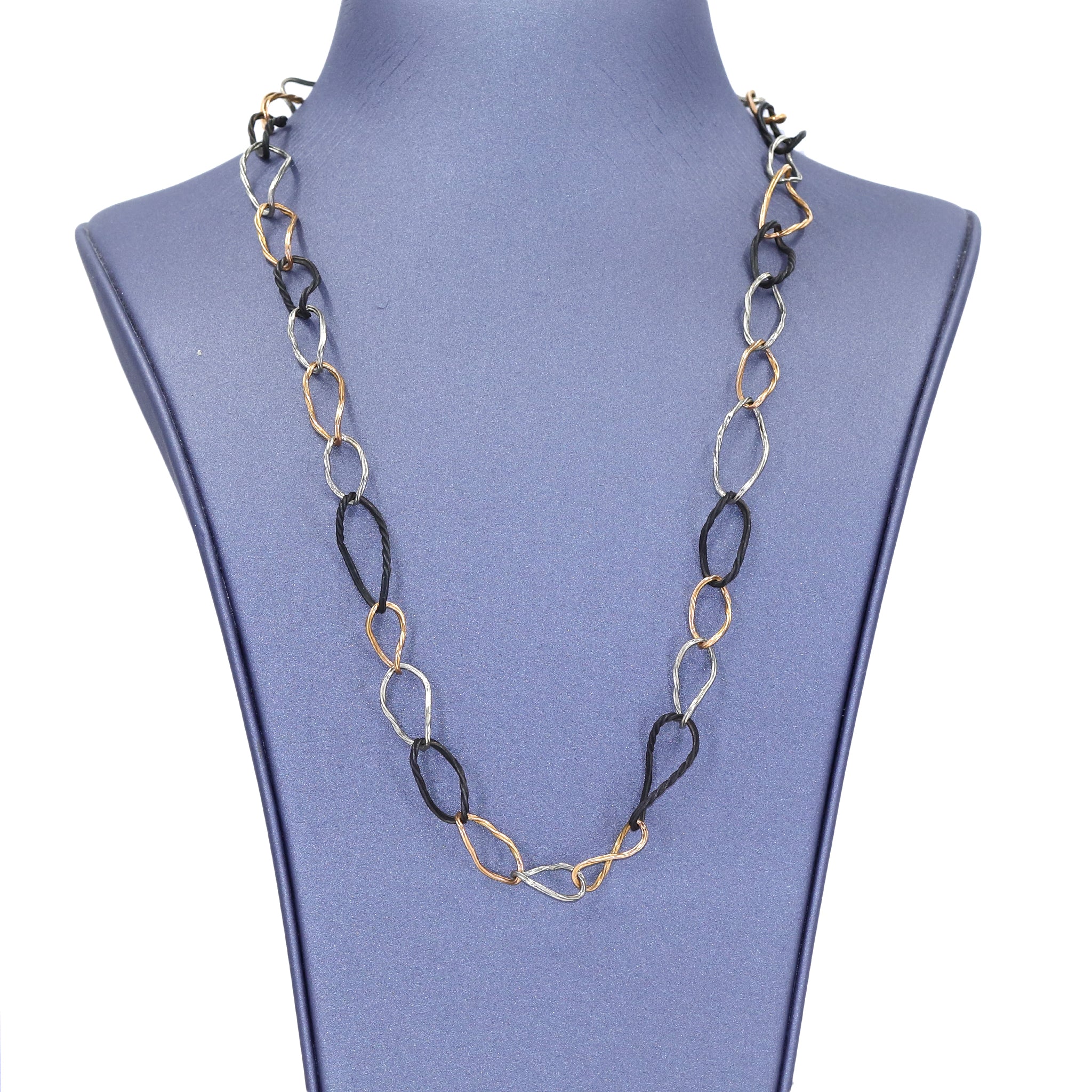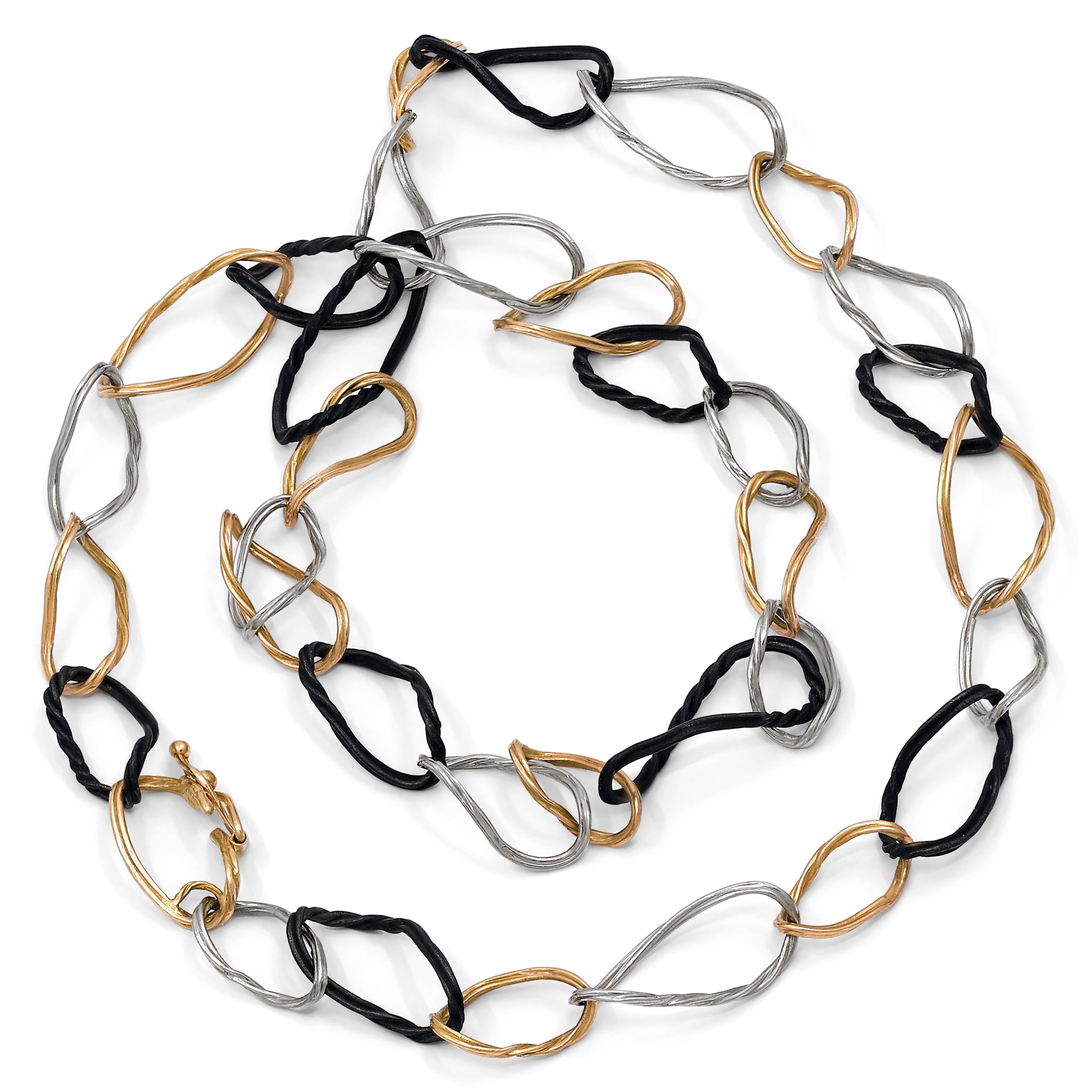Clover Necklace hand-fabricated by renowned jewelry maker Sarah Graham in a combination of 18k rose gold, 18k white gold, and the artist's signature cobalt chrome, intricately built and finished with a handmade figure-eight locking clasp that seamlessly blends into the design. 22" in length but can also be worn shorter or as a lariat.