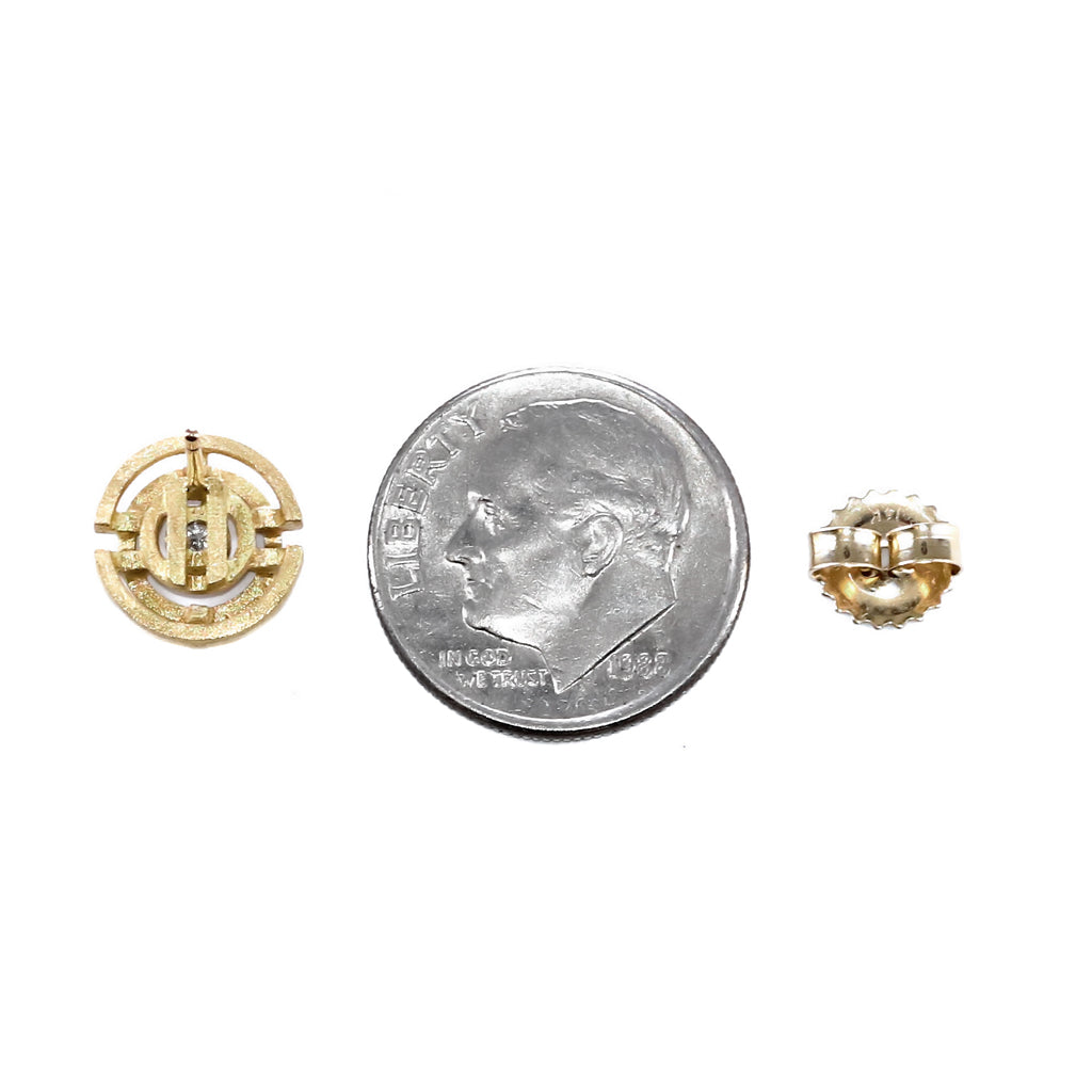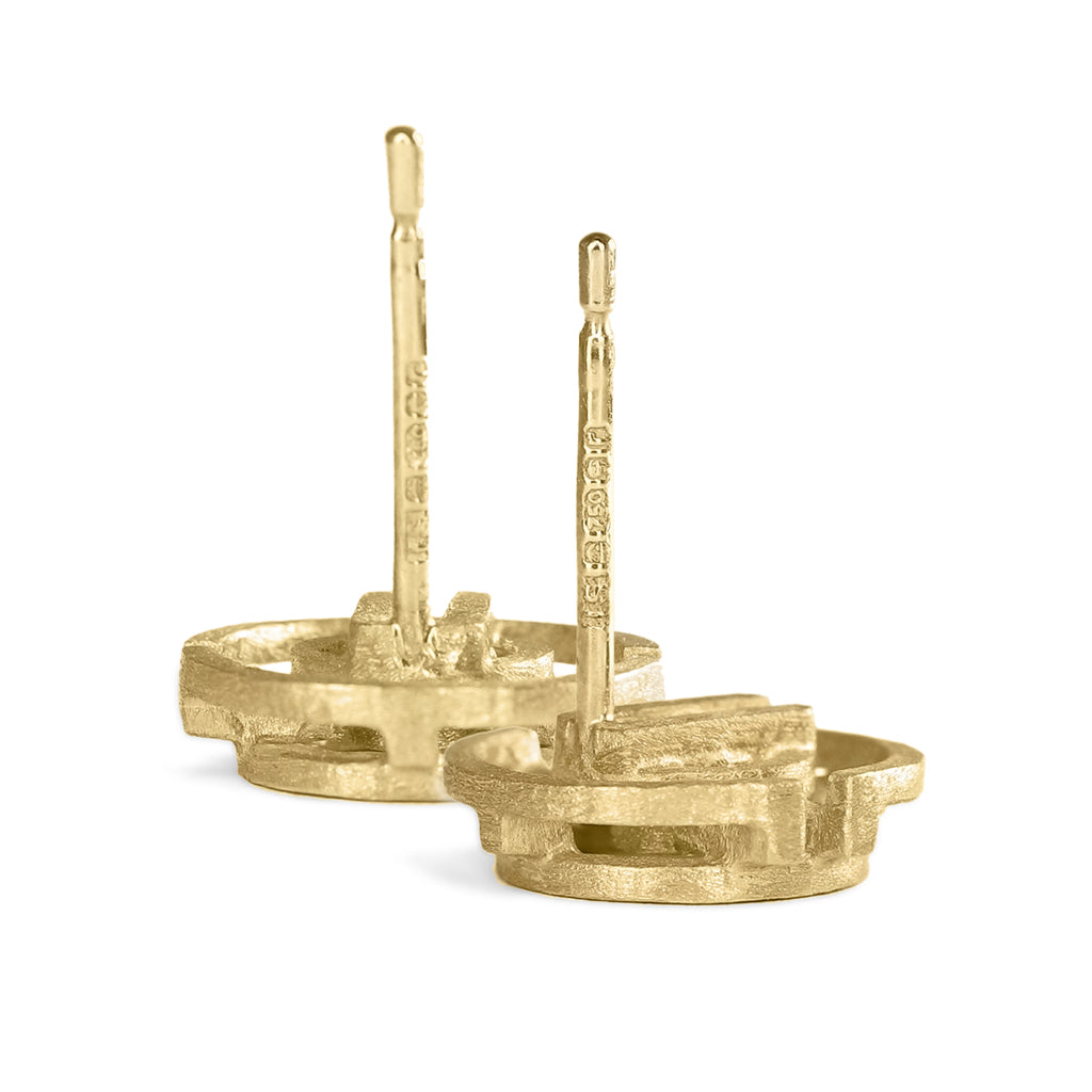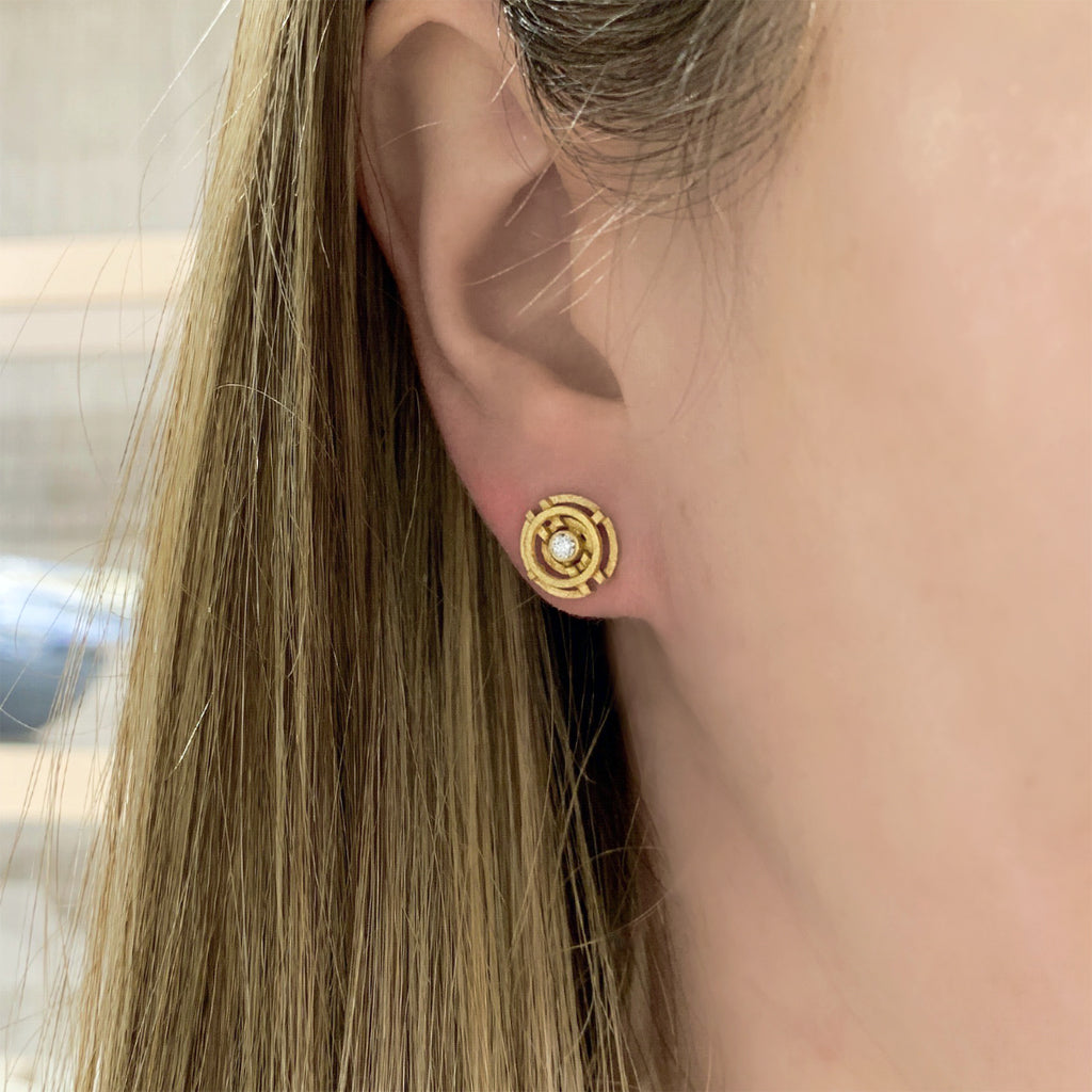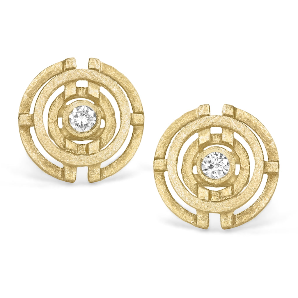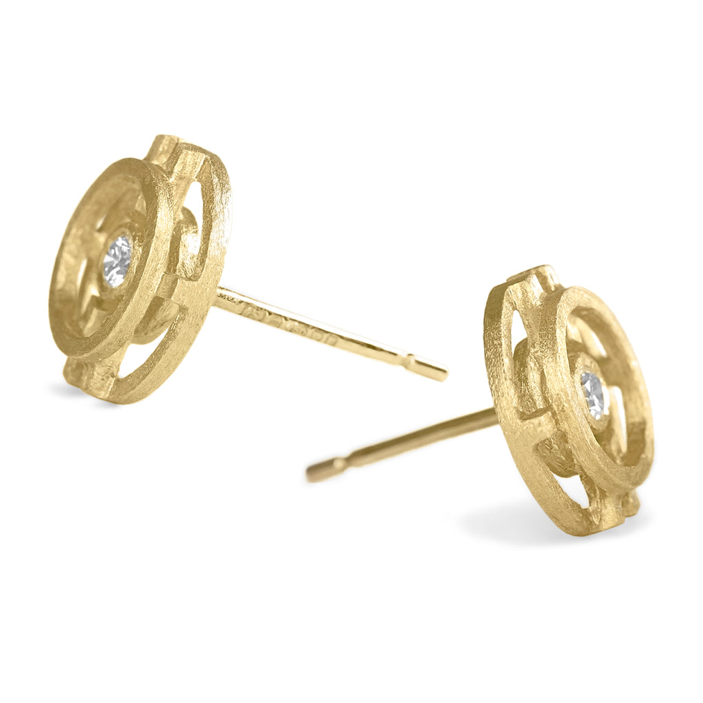 Four Circle Stud Earrings intricately handcrafted by London-based jewelry artist Shimell and Madden in signature-finished 18k yellow gold with two round brilliant-cut F/vs white diamonds totaling 0.08 carats.