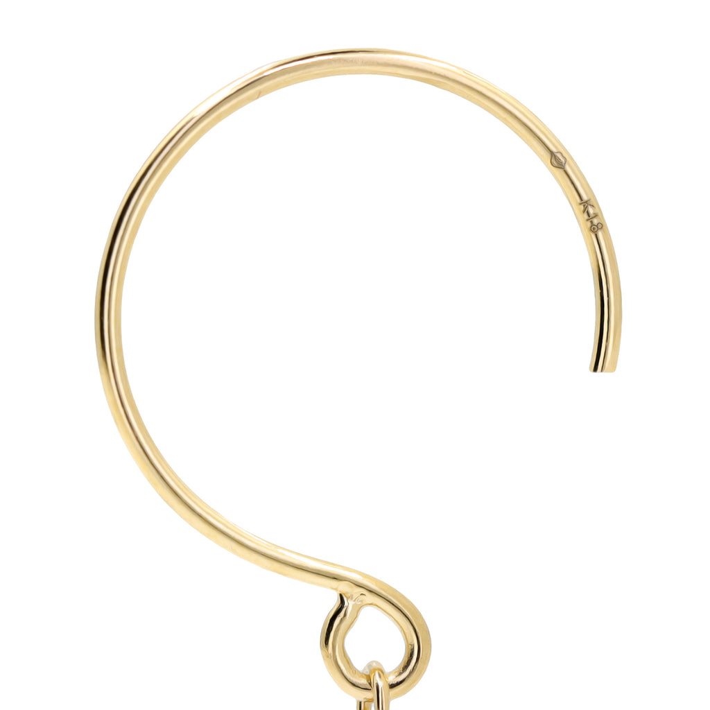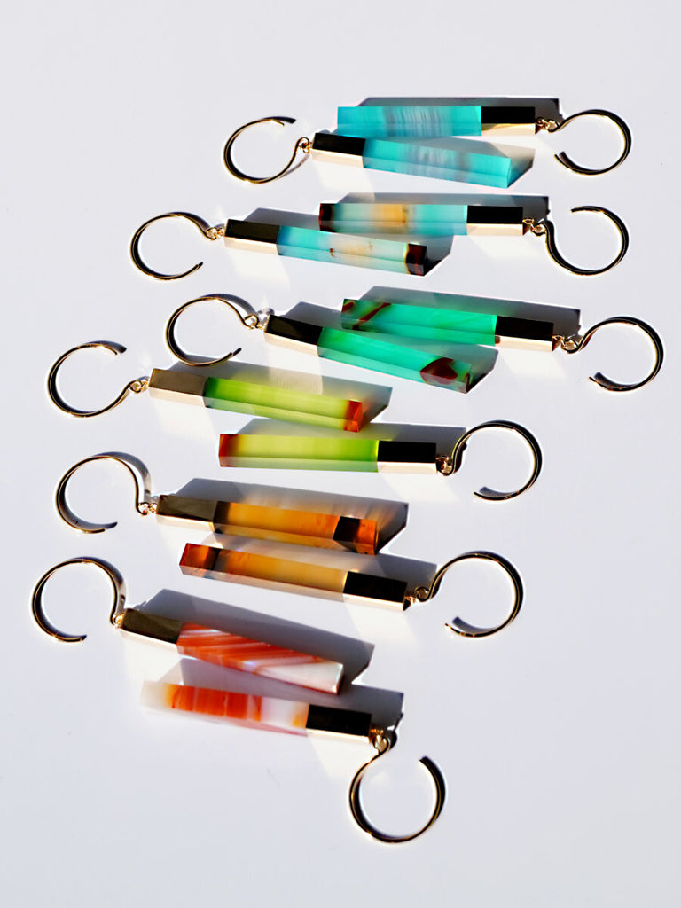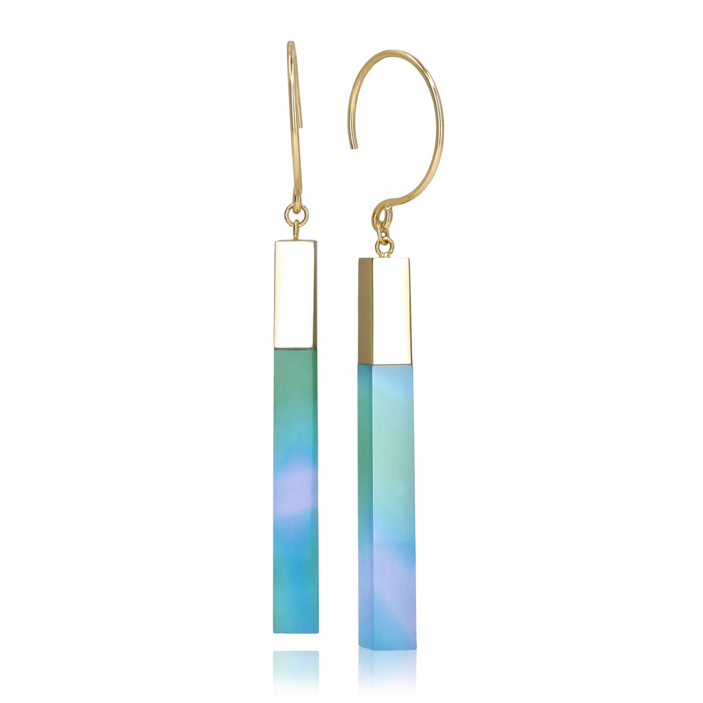 One of a Kind Earrings hand-fabricated in Japan by jewelry designer Shinobu Marotta of the renowned Talkative Atelier, featuring a sensational matched pair of sea blue chalcedony with natural color variations, each cut into long three dimensional rectangular cubes and connected to high-polished 18k yellow gold stick elements that mimic the distinctive four sided stones. The sticks dangle from handmade 18k yellow gold rounded ear wires. Stamped and hallmarked.