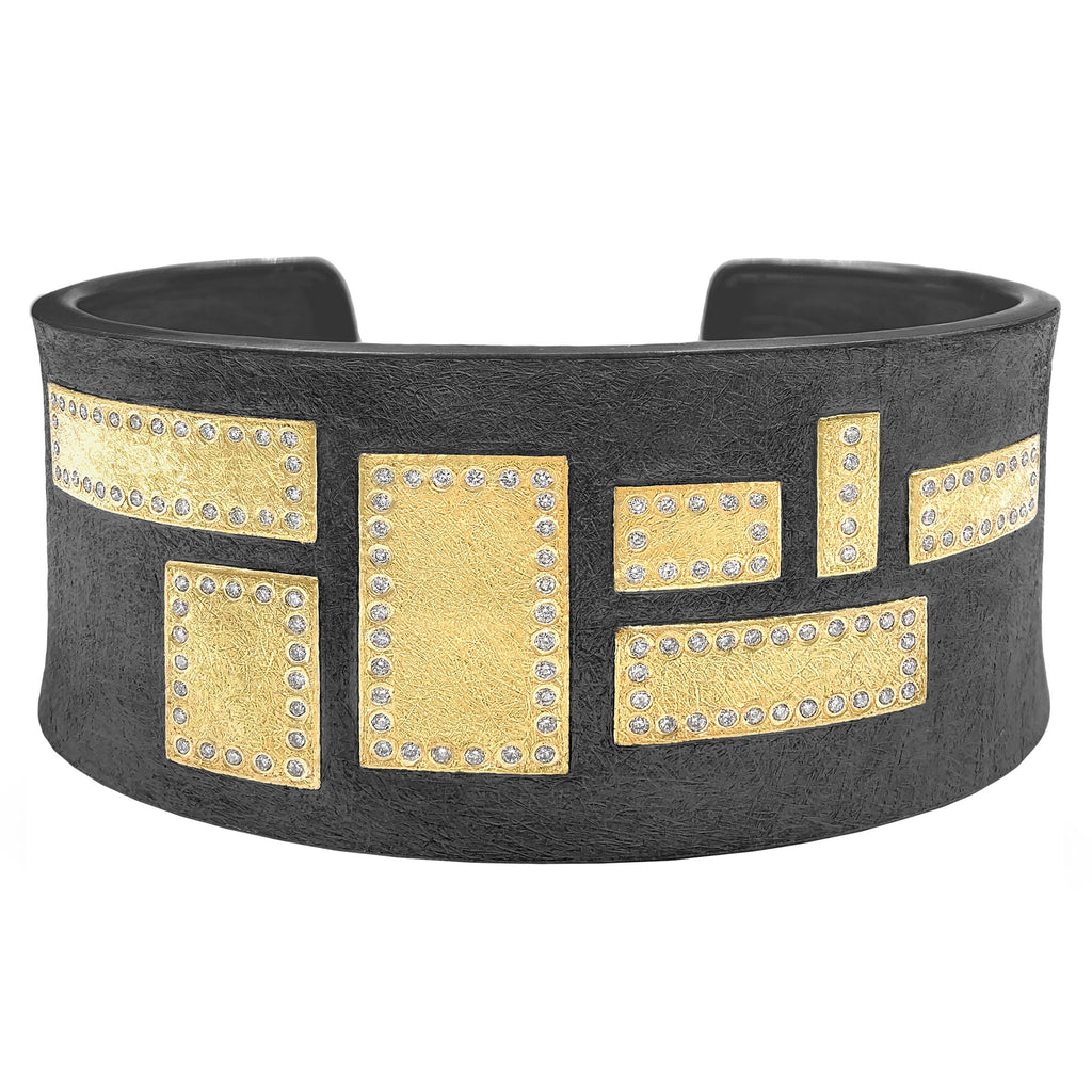 Limited Edition Gold Windows Cuff Bracelet handmade in signature patinaed sterling silver by renowned jewelry artist Todd Reed featuring seven asymmetrical matte-finished 18k yellow gold elements inlaid with 0.69 total carats of round brilliant-cut white diamonds.