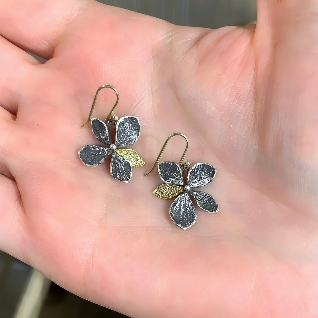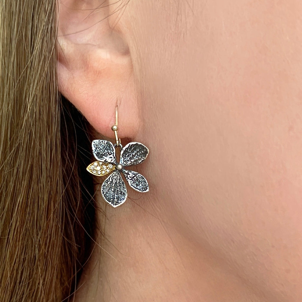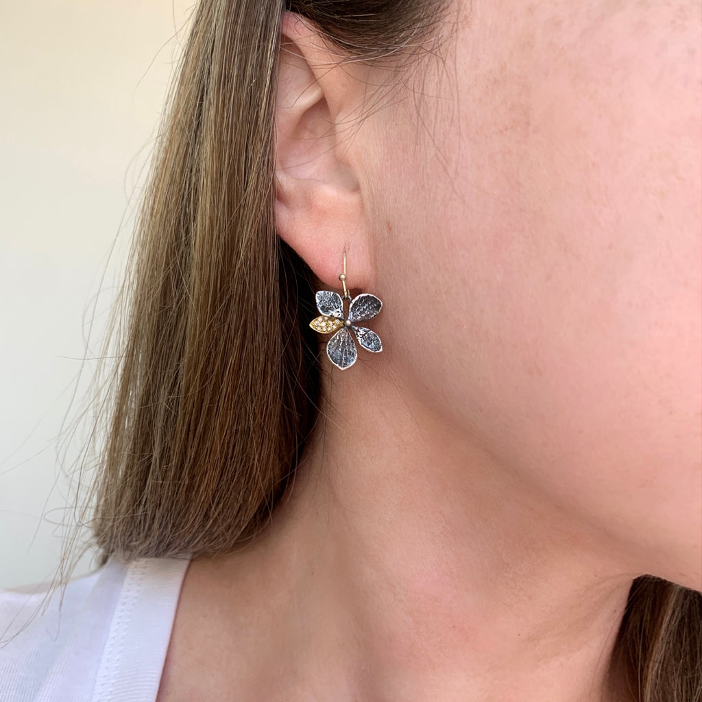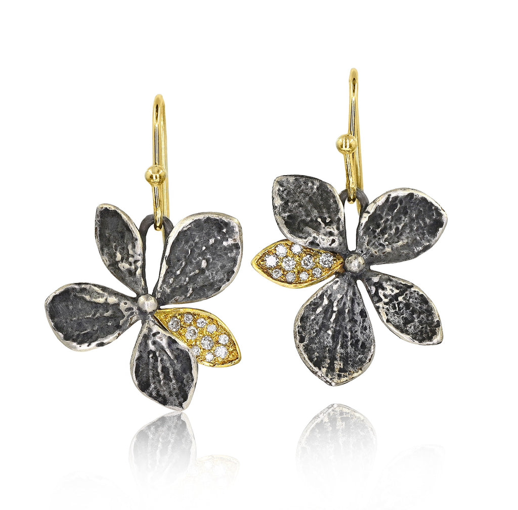 Hydrangea Dangle Drop Earrings intricately handmade by world-renowned master jewelry artist John Iversen in oxidized sterling silver featuring two 18k yellow gold petals flush-set with round brilliant-cut diamonds and finished on 18k yellow gold ear wires.