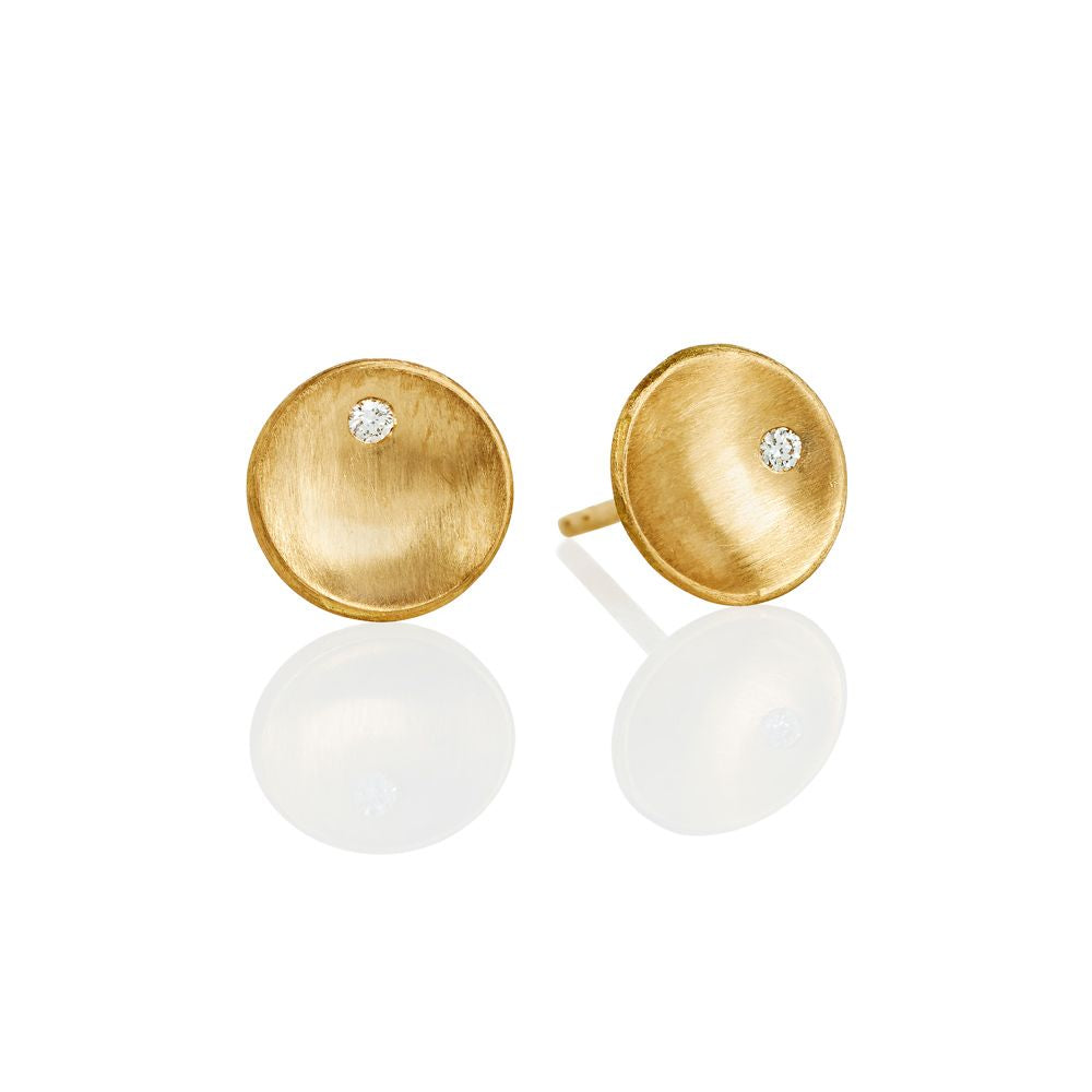 Small Concave Studs (8mm) handcrafted in Denmark by Wille Jewellery in 18k yellow gold with a single white diamond accent totaling 0.01 carats.